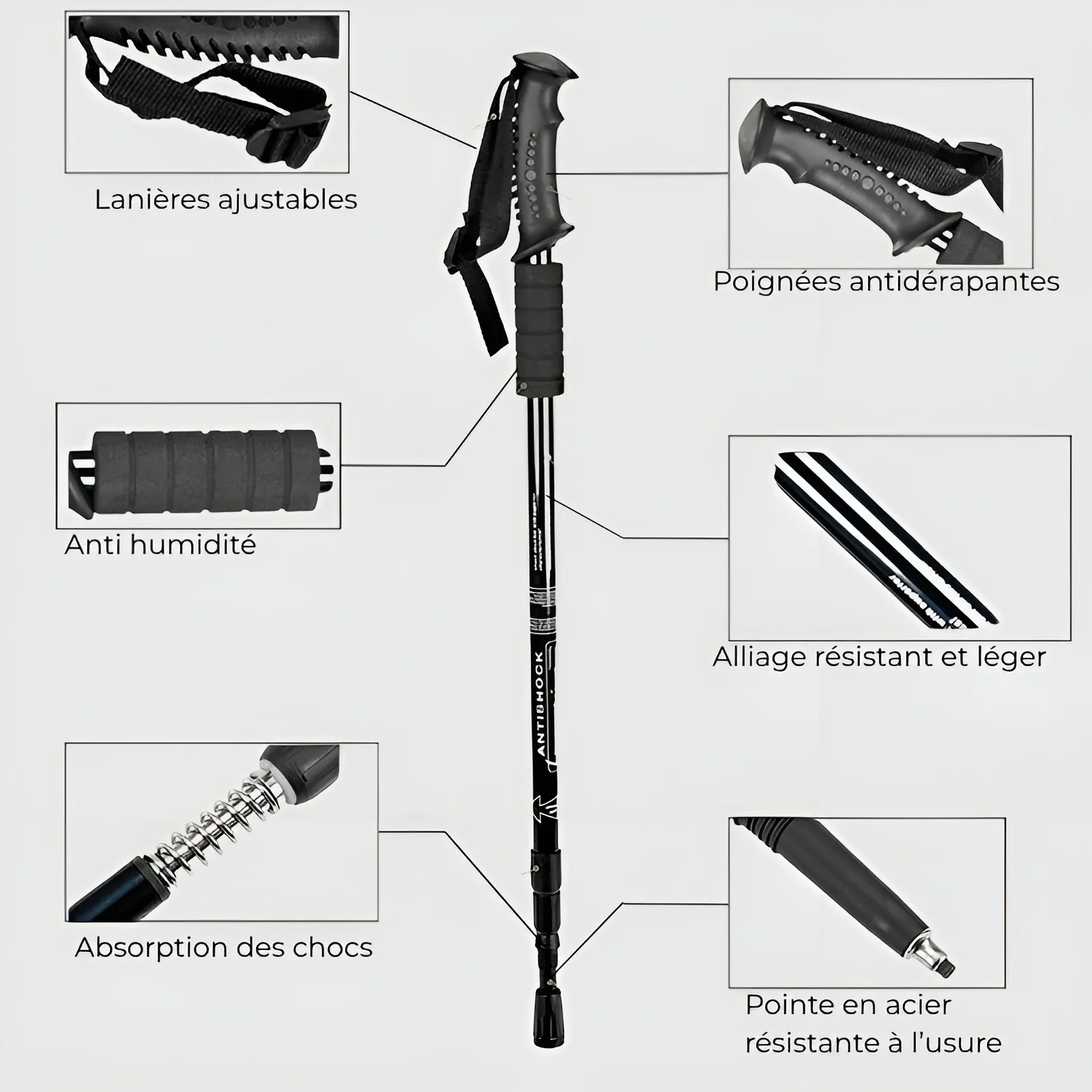 Grâce à leur poignée ergonomique et antidérapante en plastique et mousse EVA, ils offrent une excellente prise en main, même sous la pluie ou en conditions de forte chaleur. Légers, solides et ajustables de 65 à 135 cm, ils s’adaptent à toutes les tailles et à toutes les pratiques, de la simple balade à l’alpinisme engagé.