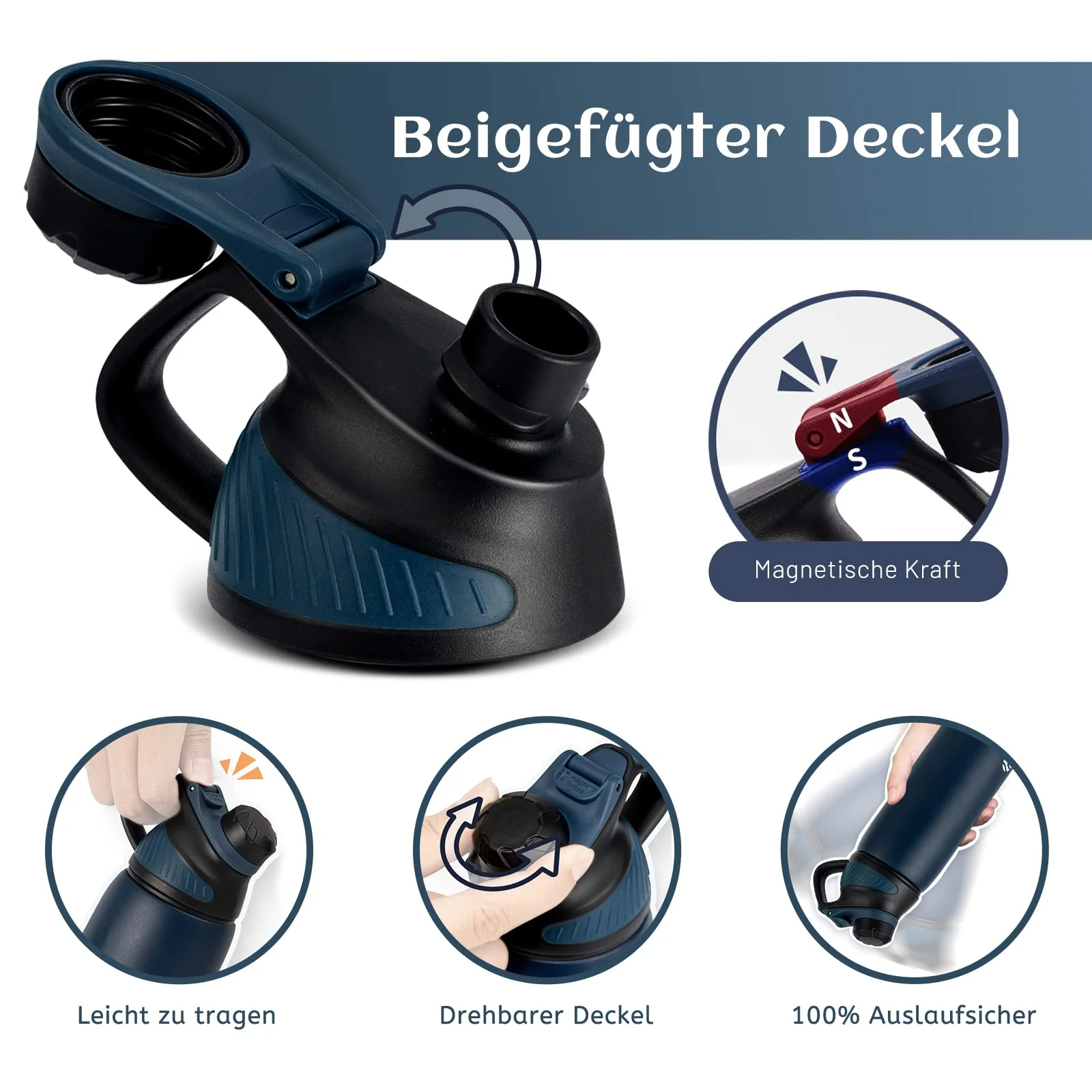 Bouteille de sport en acier inoxydable de 1 500 ml avec couvercle magnétique, bouteille d’eau isotherme, bleu