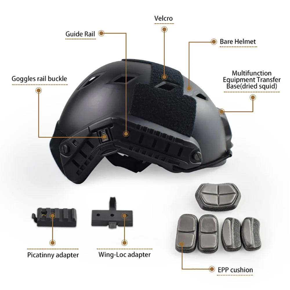 SPECIFICATIONS Poids : 528G Taille: 22*28*18 cm Saison : Universelle Accessoires du produit : 5 coussins EPP, 1 adaptateur WING-LOC, 1 adaptateur Picatinny Matériau : plastique ABS Circonférence de la tête : 54-62 cm Caractéristiques : Tampon anti-vibration Marque : Action Union