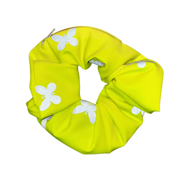Chouchou élastique avec une petite poche. Super pratique pour s’attacher les cheveux et aller faire du sport ou en petit porte monnaie le soir autour du poignet ✨ Couleur flashy et marquage rétro-réfléchissant.