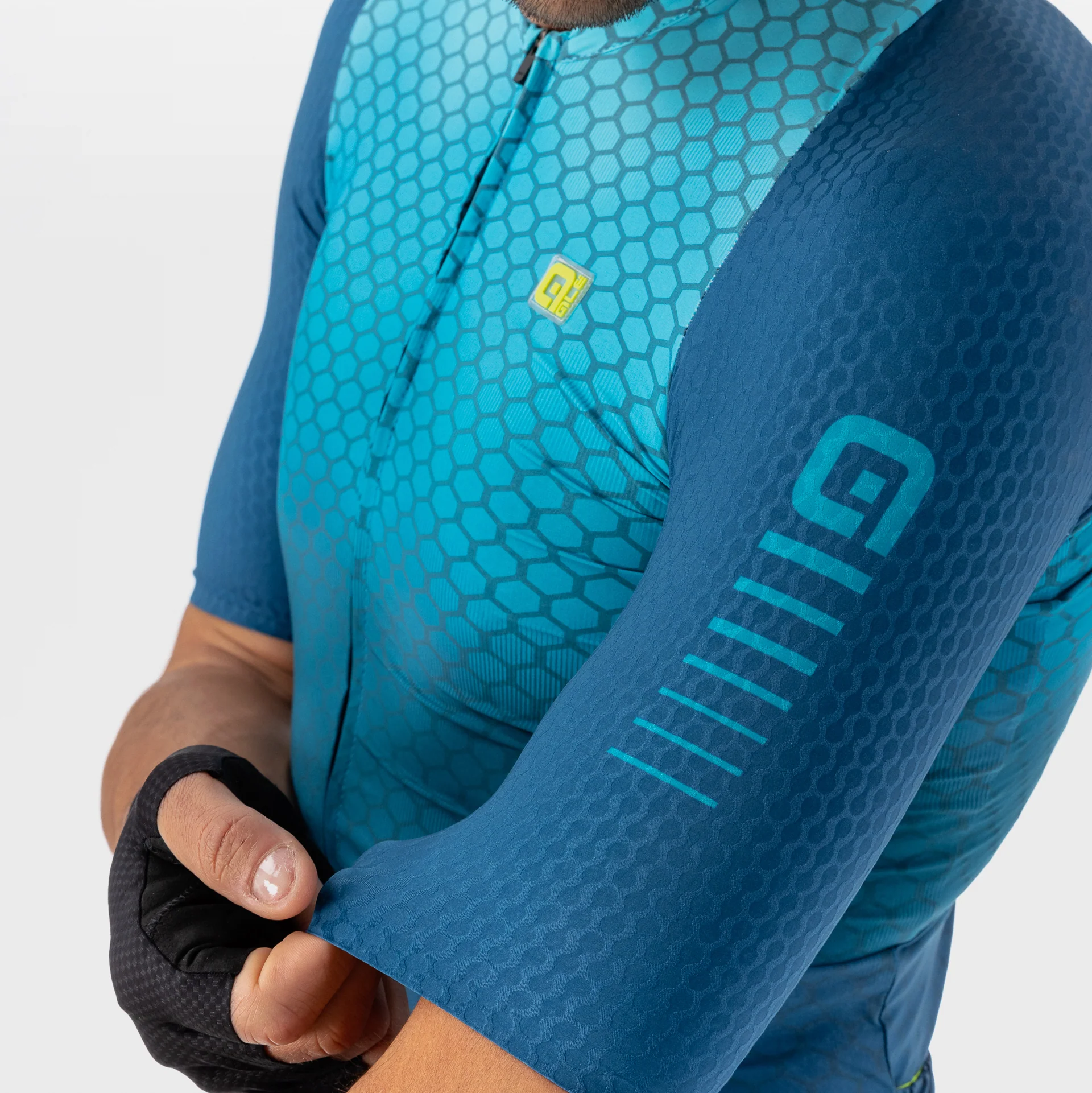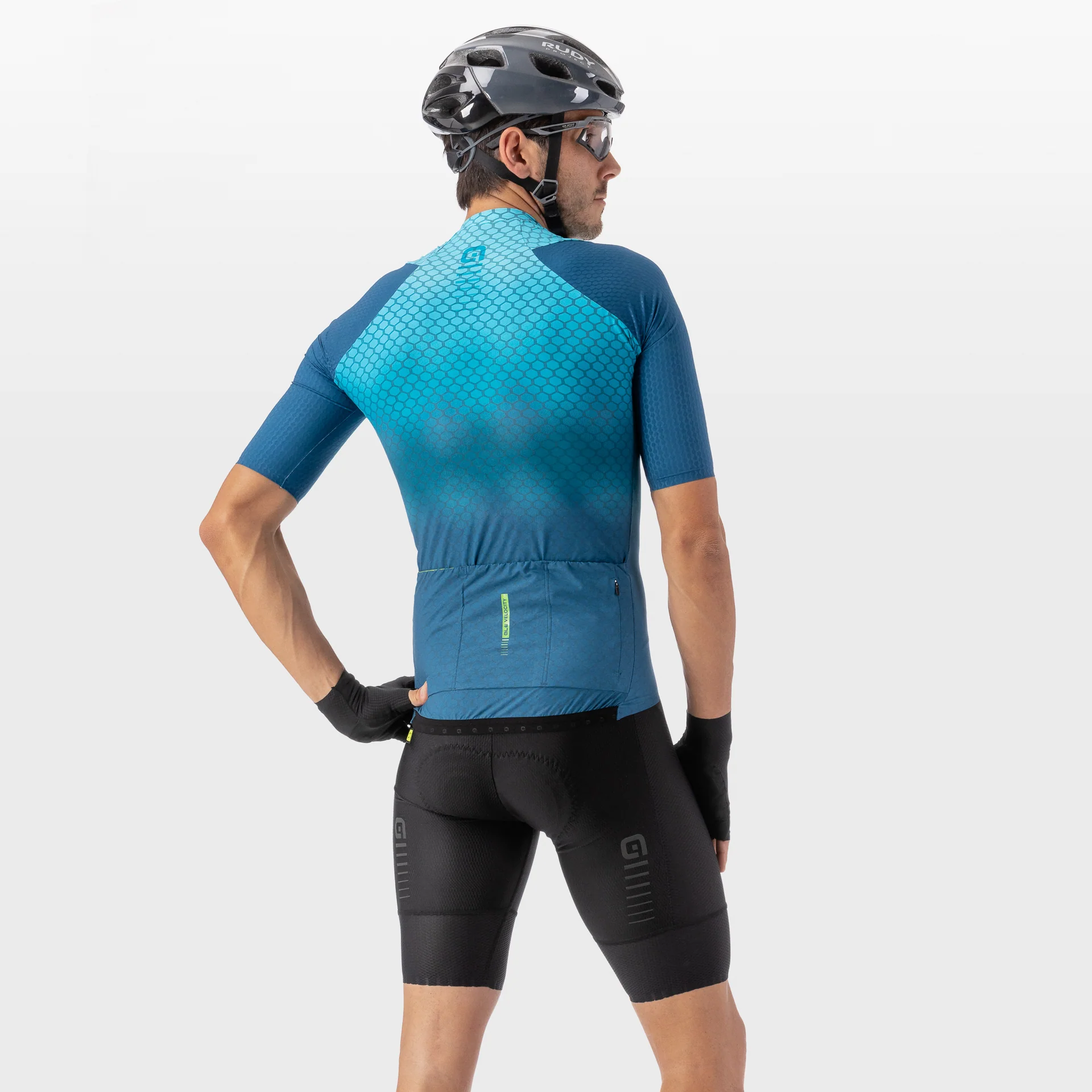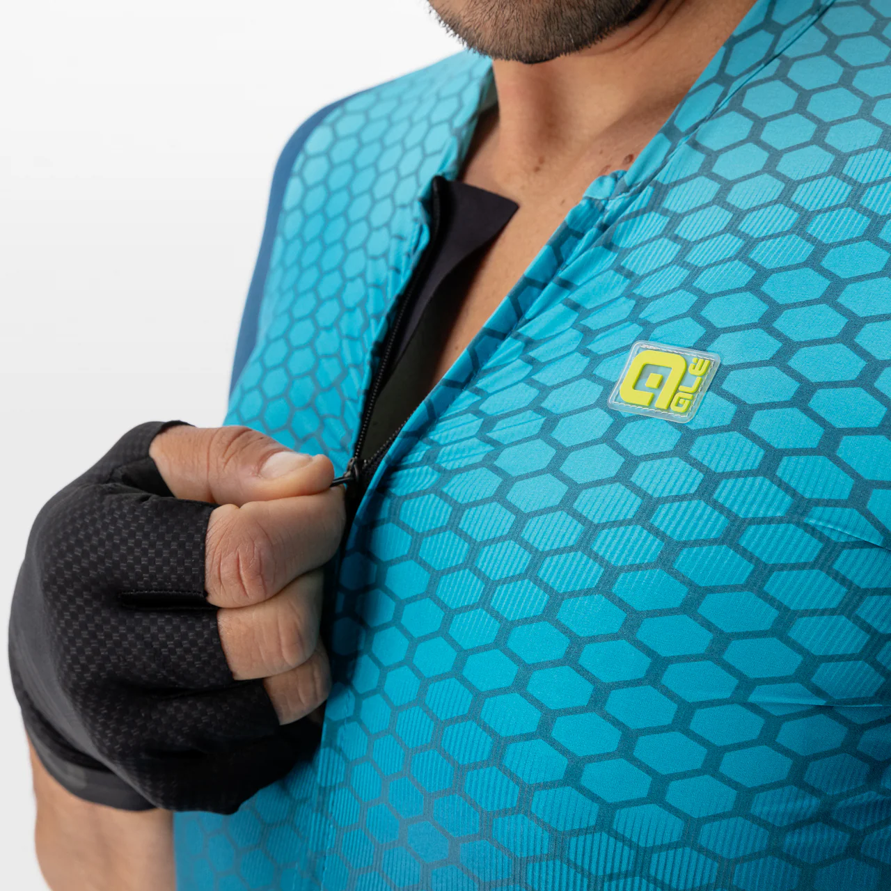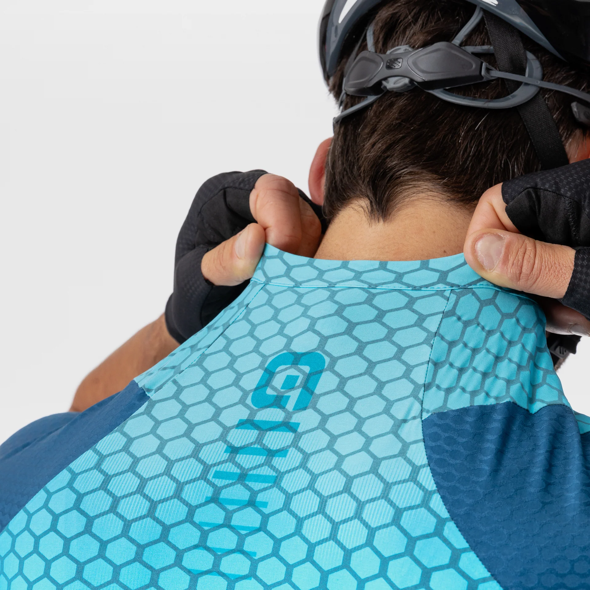 Ce maillot aérodynamique associe des tissus tous développés en soufflerie, pour un résultat à la pointe de la technologie : avec du Graphene G+ pour un effet « seconde peau » et des manches qui limitent la pénétration face à l’air pour davantage de performance. Ce matériau détient le record de conductivité thermique.