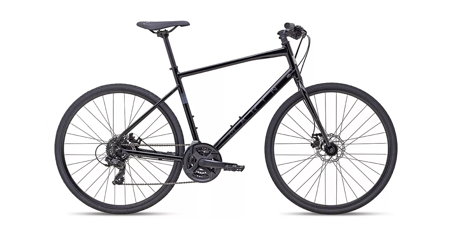 Aluminium 6061 – Marin Série 1 Fitness, roues 700C, passage interne des câbles, freins à disque, géométrie urbaine, avec supports pour garde-boue, porte-bagages et béquille.