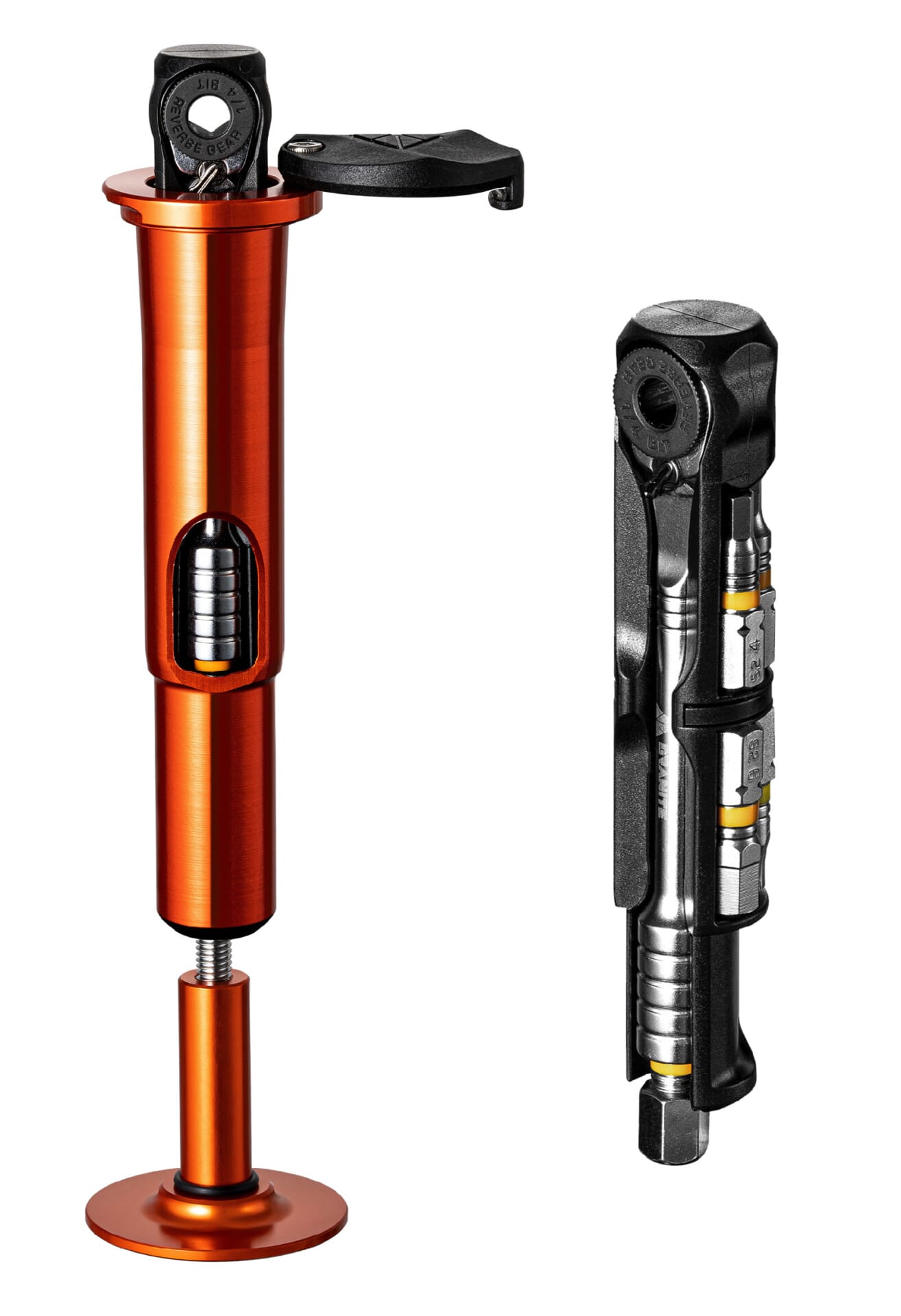 Granite Design propose un multi-outils innovant à cliquet bidirectionnel, conçu pour s’intégrer parfaitement aux pivots de fourche coniques. Ce kit complet comprend une clé à cliquet réversible et 9 embouts de haute qualité : clés Allen 2, 2,5, 3, 4, 5, 6, 8 mm, Torx T25 et un embout cruciforme PH1, ce dernier pouvant s’insérer dans la poignée pour offrir un levier supplémentaire lors des serrages difficiles. Le multi-outils intégré répond aux problématiques d’encombrement en sortie VTT grâce à son design compact. Il se compose d’une cuvette en aluminium 7075-T6 usinée CNC qui accueille le cliquet et les embouts, maintenue…
