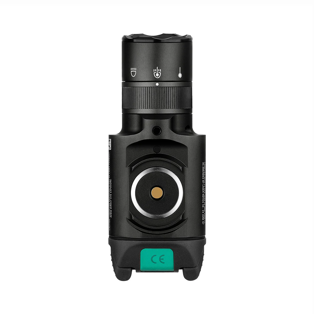 Anneau de sélection de mode : Basculez facilement entre trois modes d’éclairage (le faisceau lumineux blanc uniquement, le faisceau lumineux blanc et le laser vert combinés, le laser vert uniquement) en tournant l’anneau de sélection situé autour de la tête de la lampe.