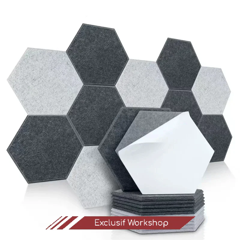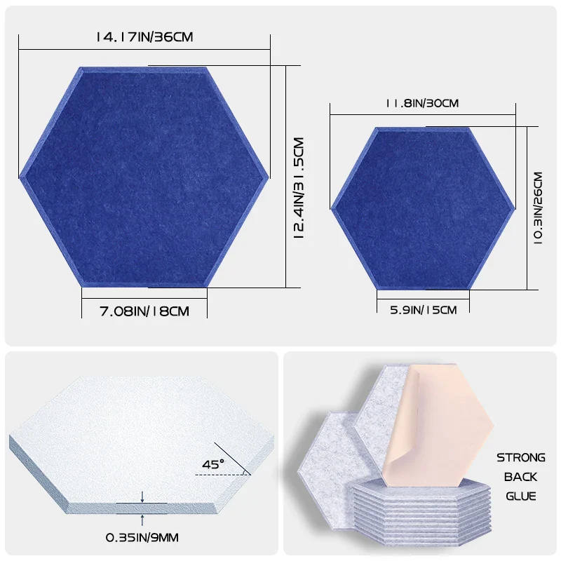 SPECIFICATIONS Matériaux : fibre de polyester. Catégorie ignifugé : catégorie A Épaisseur : 9 mm Densité : 1,21 kg/M2 (effet d’absorption acoustique moyen) Taille : Petit hexagone : 30 x 26 cm. Grande hexagone : 36 x 31 cm.