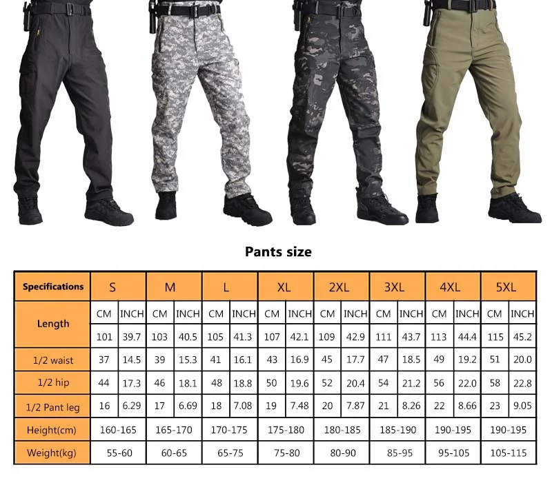 SPECIFICATIONS Pantalons militaires imperméables Couleur: vert , noir, bleu Matériau : 70 % coton + 30 % élasthanne Taille: S/M/L/XL/XXL/XXXL Totalement de 4 grandes poches, 2 poches zippées, 2 poches à fermeture auto-agrippant. Conception taille haute réglable. Doublure en polaire douce pour plus de confort et de chaleur. Poches zippées surdimensionnées au bas du dos.
