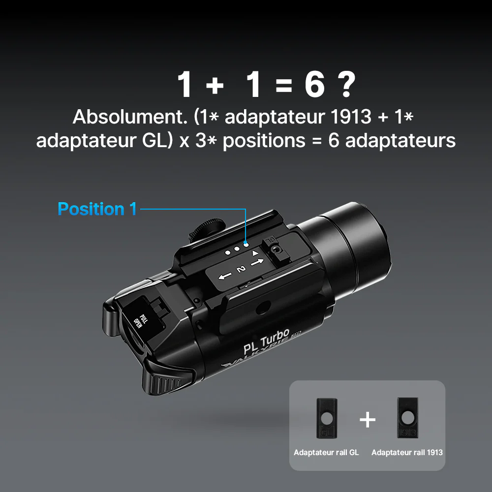 La PL Turbo Valkyrie (ou PL Turbo) est une lampe torche montée sur rail Picatiny ou rail Glock, offrant une puissance maximale de 800 lumens et une portée de 515 mètres. Elle émet un faisceau concentré et un faisceau large en même temps, vous permettant d’observer facilement votre environnement, proche comme lointain. Grâce au bloc coulissant, la PL Turbo s’adapte à une large gamme de configurations courtes comme longues disposant d’un rail Picatinny (MIL-STD-1913) ou d’un rail GLOCK. Le très fiable mécanisme de verrouillage par vis garantit une stabilité extrême. Les interrupteurs intuitifs et ambidextres permettent une activation rapide du mode stroboscopique et un contrôle instantané, d’un doigt, de l’éclairage momentané ou continu. La lampe montée sur rail est alimentée par deux piles CR123A. Son corps robuste en aluminium anodisé a été conçu pour résister aux rayures et à la corrosion. La PL Turbo sera votre outil d’éclairage principal pour les recherches en extérieur, l’autodéfense, les sauvetages & recherches ainsi qu’un outil essentiel pour les forces de l’ordre.