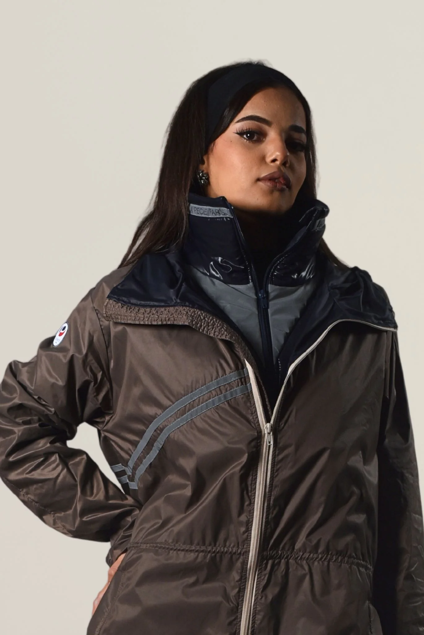 Une capuche conçue dans un matériau fin, se range dans une poche discrète et invisible située à l’arrière du cou pour faire face à toutes les situations.
