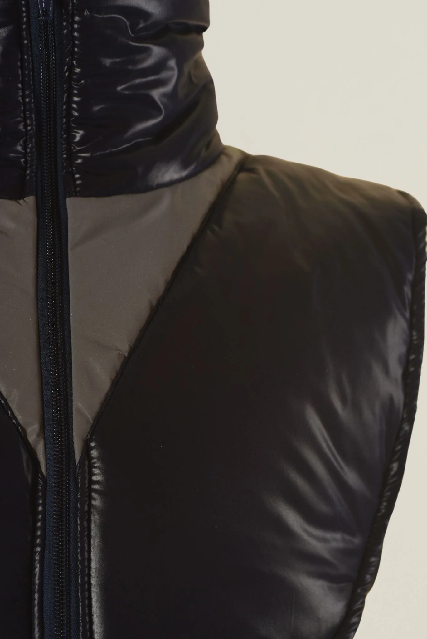 Incrustation de matière rétro réfléchissante dans un tissu technique soyeux avec matelassage sur duvet de canard .
