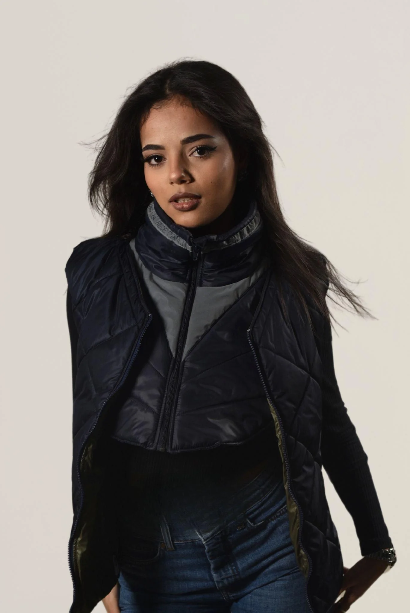 Incrustation de matière rétro réfléchissante dans un tissu technique soyeux avec matelassage sur duvet de fibres synthétiques recyclées, , savoir faire de la griffe