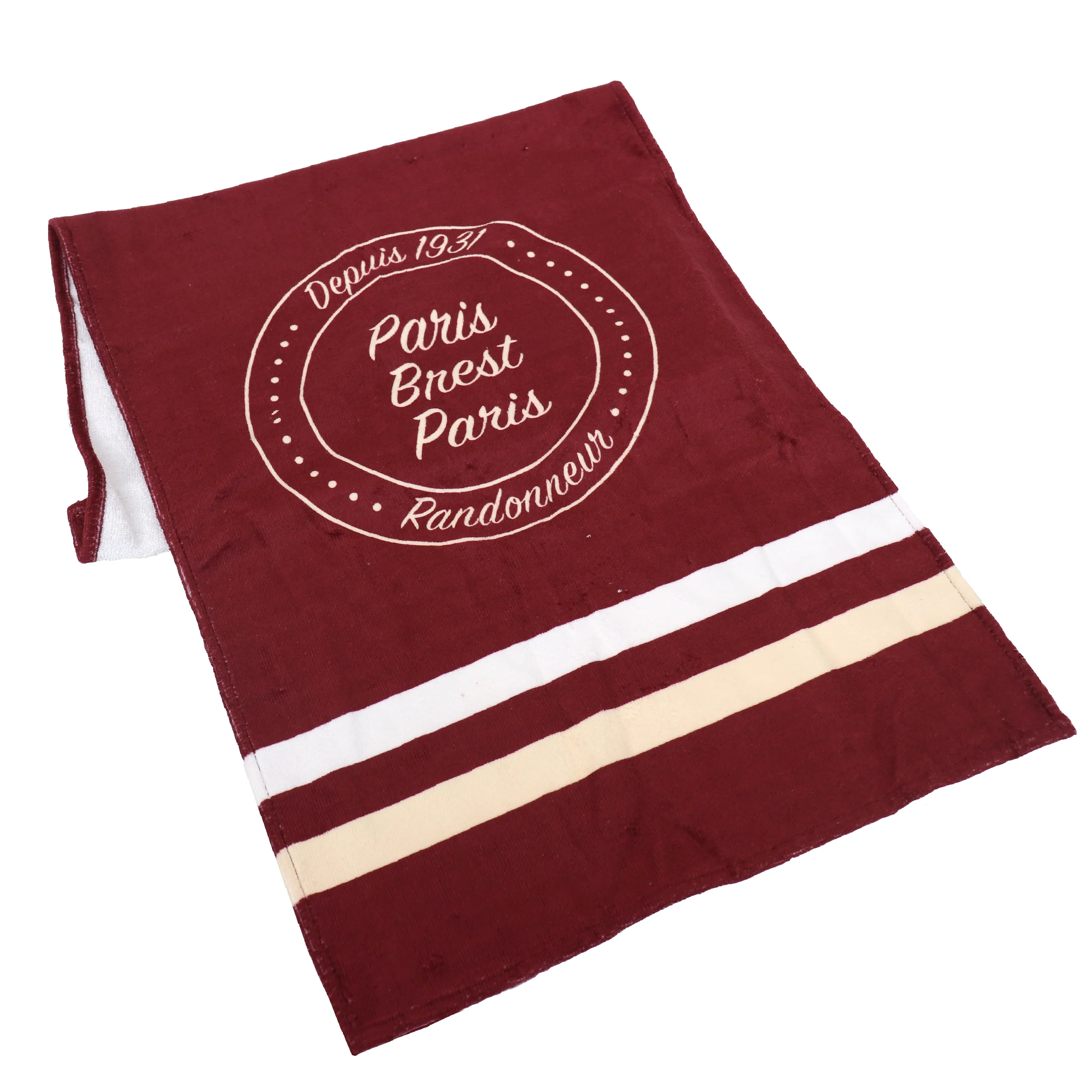 Cet accessoire reprend bien évidemment le design positionné sur l’intégralité des produits fabriqués pour la 19e édition de Paris-Brest-Paris Randonneur. Le blason spécifique est au cœur du produit, afin de magnifier la serviette mais aussi pour amplifier son design. Les deux bandes blanche et beige sont également imprimées, tel un rappel à la célèbre pâtisserie. Disponible en édition limitée, la serviette : dimension.